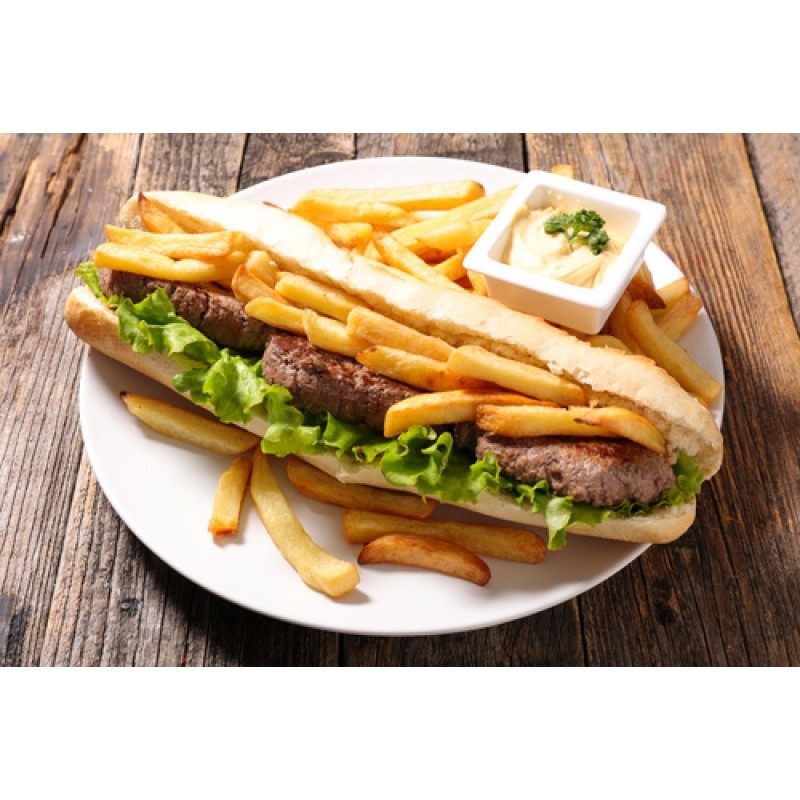 Demi baguette, Salade, Tomate, Emmental, Frites et 3 Viande ai choix : American Steack, Poulet ou Saucisses